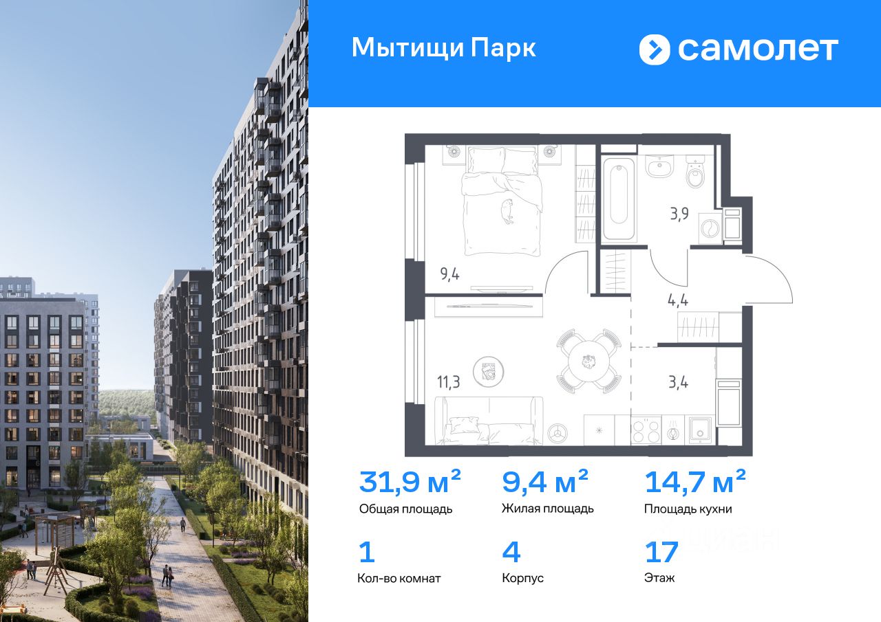 Строим кварталы для жизни с заботой о будущем. Предлагается 1-комнатная квартира комфорт-класса 31,9 кв.м в корпусе 4 на 17 этаже, в ЖК "Мытищи Парк"