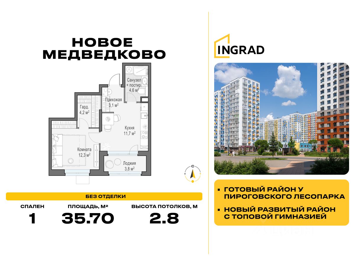 Прямая продажа от застройщика. В жилом квартале, расположенном в северо-западной части города Мытищи, продаётся 1-спальная квартира площадью 35.70 кв.м без отделки. Квартира расположена на 10 этаже 18-этажного дома, корпус 43, в жилом квартале комфорт-класса Новое Медведково (застройщик ГК Инград).