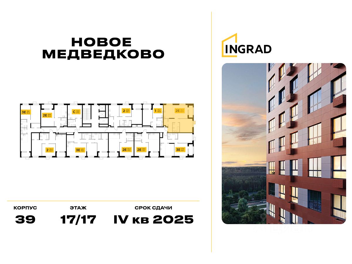 Прямая продажа от застройщика. В жилом квартале, расположенном в северо-западной части города Мытищи, продаётся 2-спальная квартира площадью 62.40 кв.м без отделки. Квартира расположена на 17 этаже 17-этажного дома, корпус 39, в жилом квартале комфорт-класса Новое Медведково (застройщик ГК Инград).