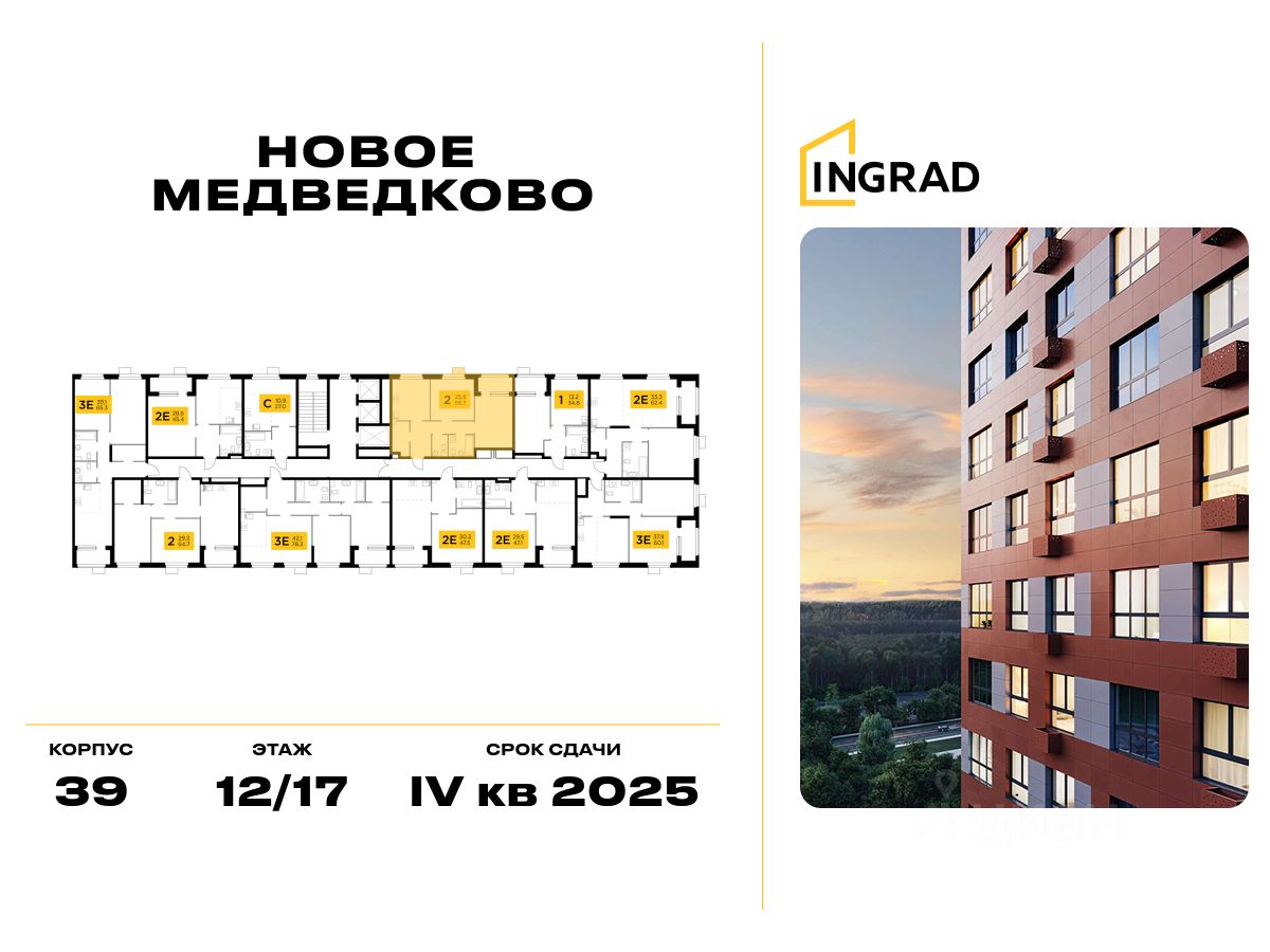 Прямая продажа от застройщика. В жилом квартале, расположенном в северо-западной части города Мытищи, продаётся 2-спальная квартира площадью 56.70 кв.м без отделки. Квартира расположена на 12 этаже 17-этажного дома, корпус 39, в жилом квартале комфорт-класса Новое Медведково (застройщик ГК Инград).