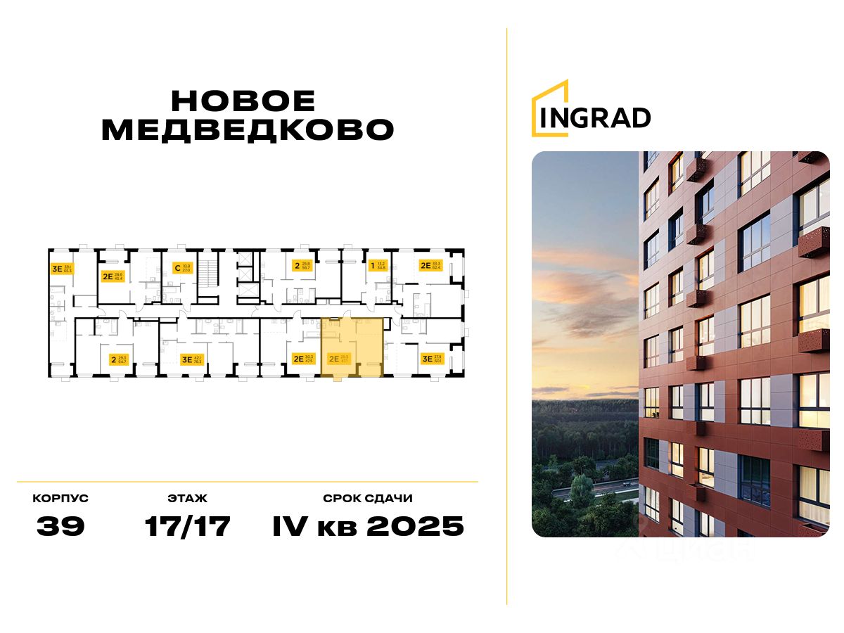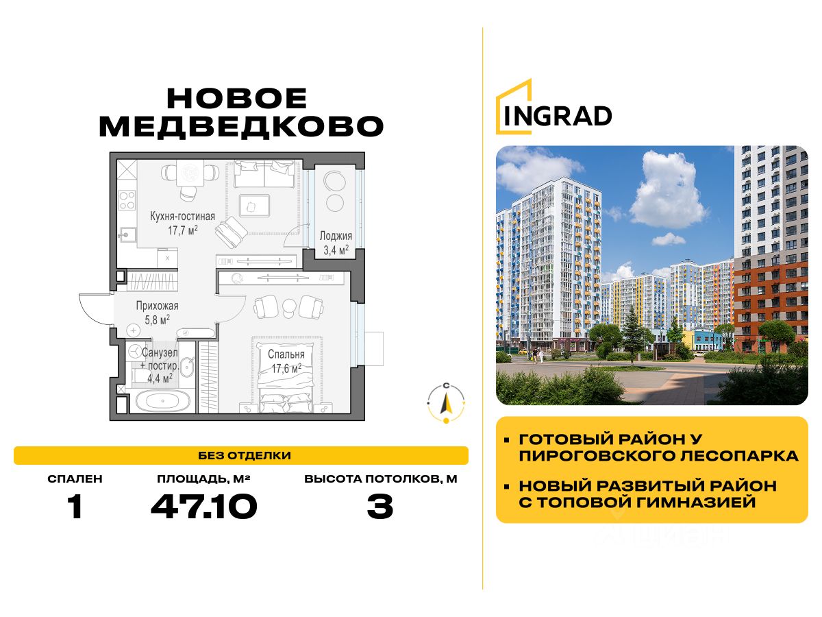 Прямая продажа от застройщика. В жилом квартале, расположенном в северо-западной части города Мытищи, продаётся 1-спальная квартира площадью 47.10 кв.м без отделки. Квартира расположена на 17 этаже 17-этажного дома, корпус 39, в жилом квартале комфорт-класса Новое Медведково (застройщик ГК Инград).