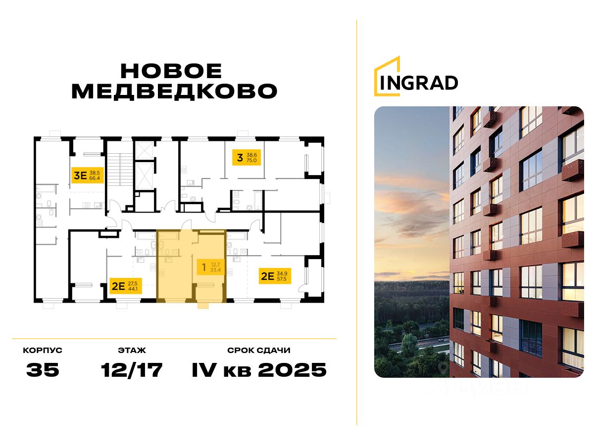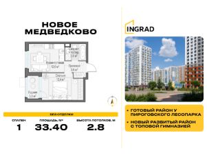 Прямая продажа от застройщика. В жилом квартале, расположенном в северо-западной части города Мытищи, продаётся 1-спальная квартира площадью 33.40 кв.м без отделки. Квартира расположена на 13 этаже 17-этажного дома, корпус 35, в жилом квартале комфорт-класса Новое Медведково (застройщик ГК Инград).
