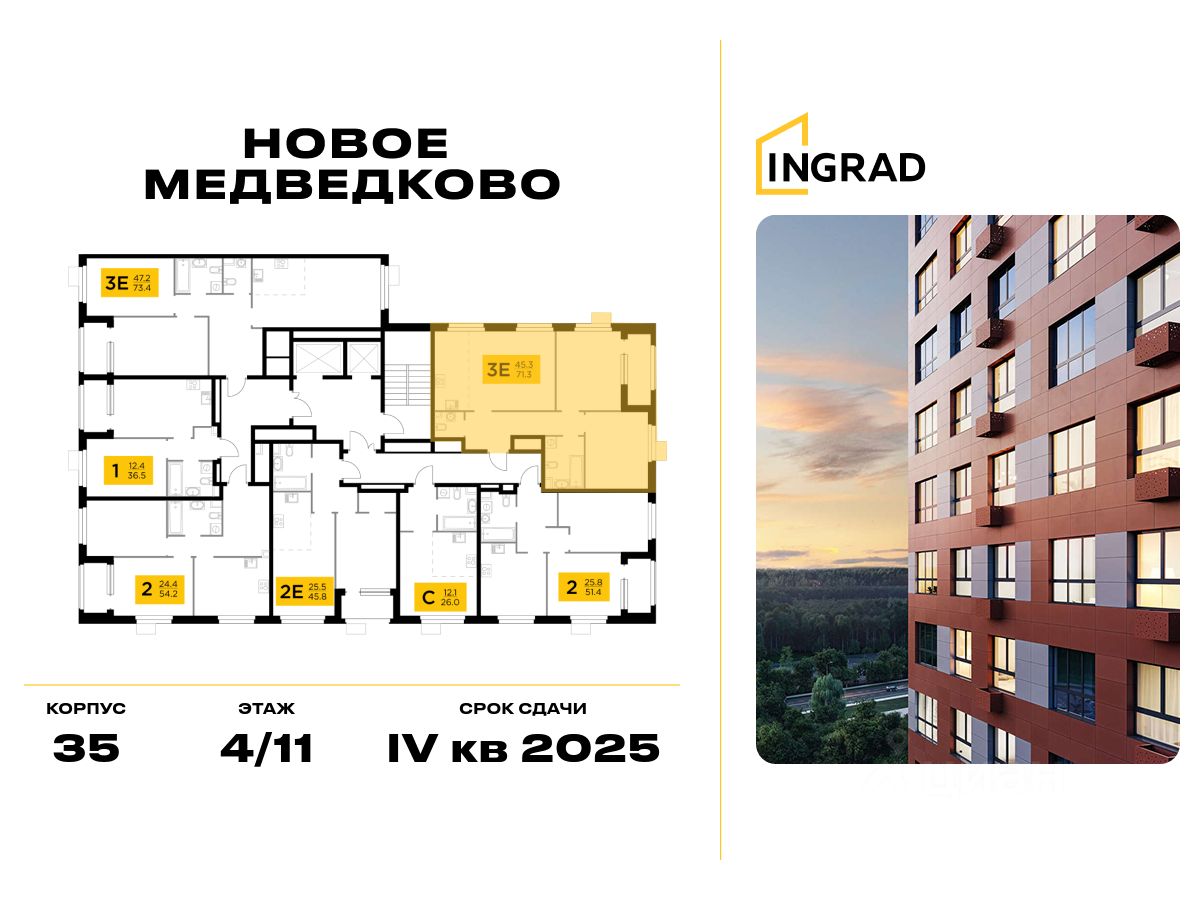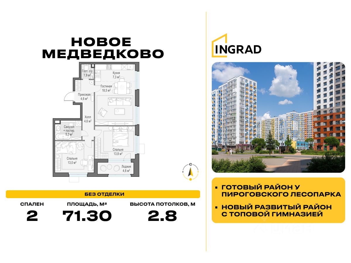 Прямая продажа от застройщика. В жилом квартале, расположенном в северо-западной части города Мытищи, продаётся 2-спальная квартира площадью 71.30 кв.м без отделки. Квартира расположена на 4 этаже 11-этажного дома, корпус 35, в жилом квартале комфорт-класса Новое Медведково (застройщик ГК Инград).