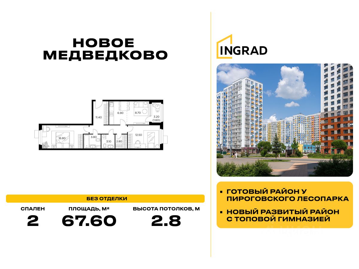Прямая продажа от застройщика. В жилом квартале, расположенном в северо-западной части города Мытищи, продаётся 2-спальная квартира площадью 67.60 кв.м без отделки. Квартира расположена на 13 этаже 15-этажного дома, корпус 35, в жилом квартале комфорт-класса Новое Медведково (застройщик ГК Инград).