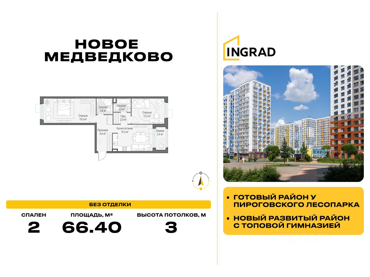 Прямая продажа от застройщика. В жилом квартале, расположенном в северо-западной части города Мытищи, продаётся 2-спальная квартира площадью 66.40 кв.м без отделки. Квартира расположена на 17 этаже 17-этажного дома, корпус 35, в жилом квартале комфорт-класса Новое Медведково (застройщик ГК Инград).