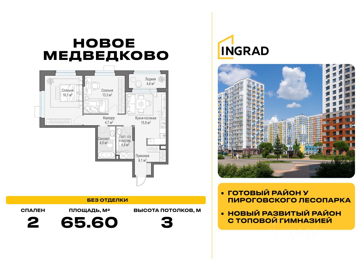 Прямая продажа от застройщика. В жилом квартале, расположенном в северо-западной части города Мытищи, продаётся 2-спальная квартира площадью 65.60 кв.м без отделки. Квартира расположена на 18 этаже 18-этажного дома, корпус 41, в жилом квартале комфорт-класса Новое Медведково (застройщик ГК Инград).