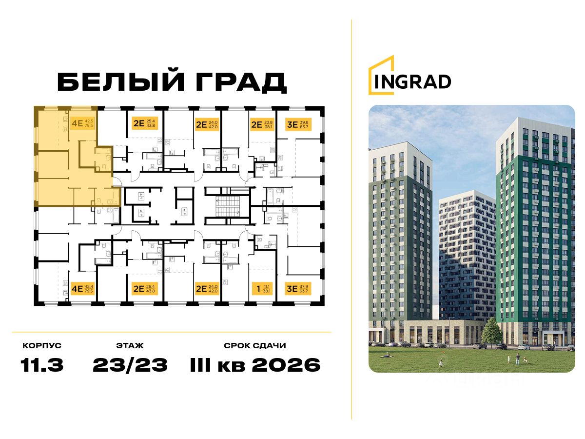 Пряма продажа от застройщика. В жилом квартале комфорт-класса "Белый Град" (застройщик ГК Инград) продаётся 4-спальная квартира площадью 79.50 кв.м без отделки. Квартира расположена на 23 этаже 23-этажного дома, корпус 11.3.