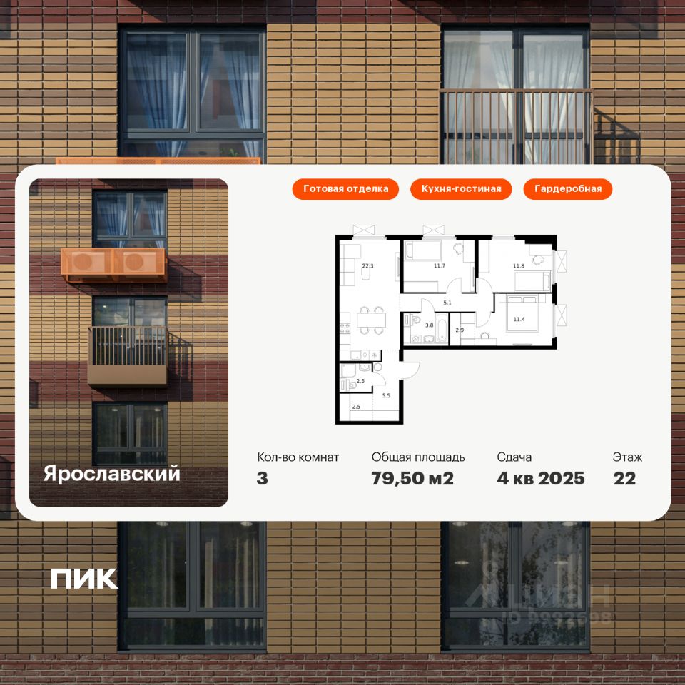 Продаётся 3-комн. квартира площадью 79,5 кв.м на 22 этаже 25 этажного дома (Корпус 16.4, Секция 4) проекта ПИК Ярославский. Светлый просторный подъезд на уровне земли, функциональная планировка, большие окна, c отделкой.
