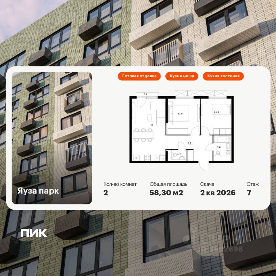 Продаётся 2-комн. квартира площадью 58,3 кв.м на 7 этаже 24 этажного дома (Корпус 5, Секция 1) проекта ПИК Яуза парк. Светлый просторный подъезд на уровне земли, функциональная планировка, большие окна, c отделкой.