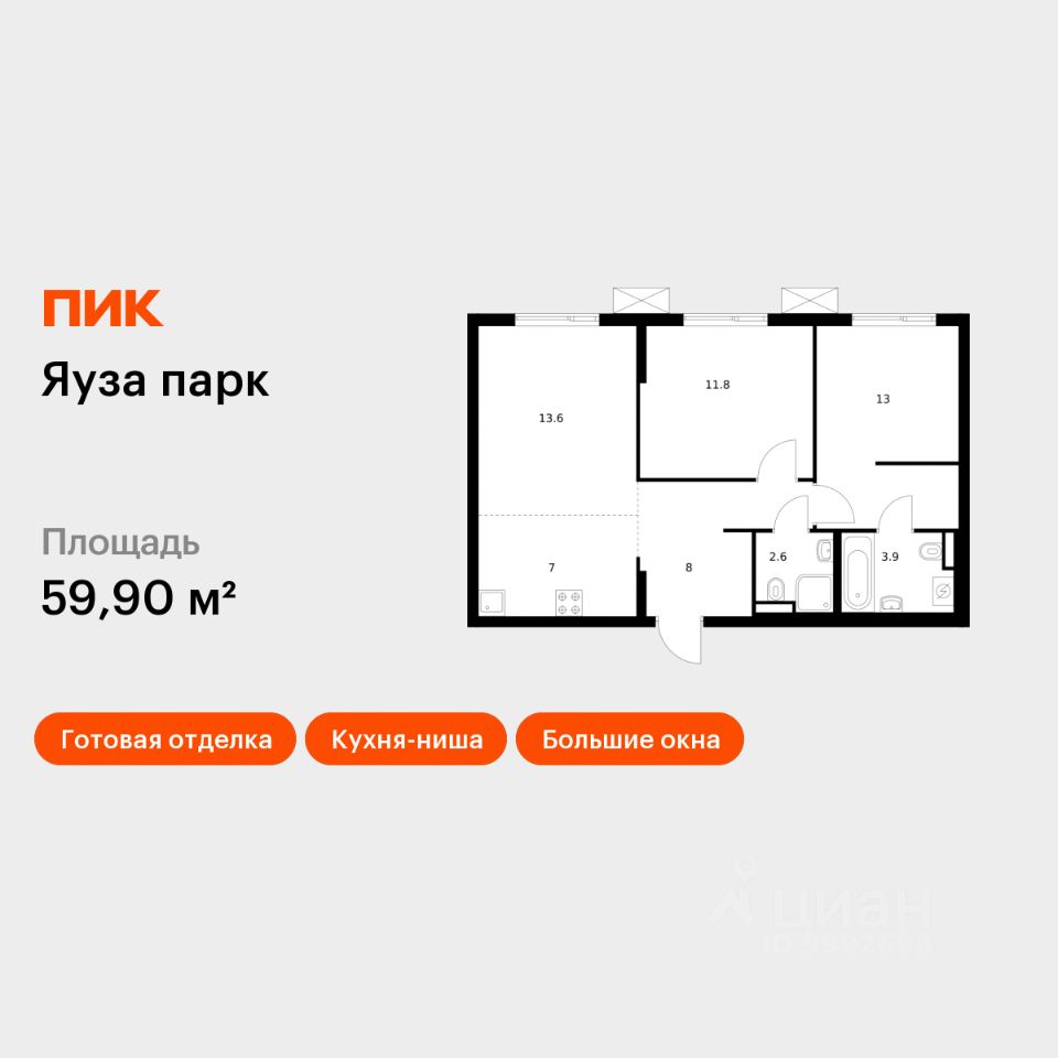 Продаётся 2-комн. квартира площадью 59,9 кв.м на 21 этаже 24 этажного дома (Корпус 7, Секция 1) проекта ПИК Яуза парк. Светлый просторный подъезд на уровне земли, функциональная планировка, большие окна, c отделкой.