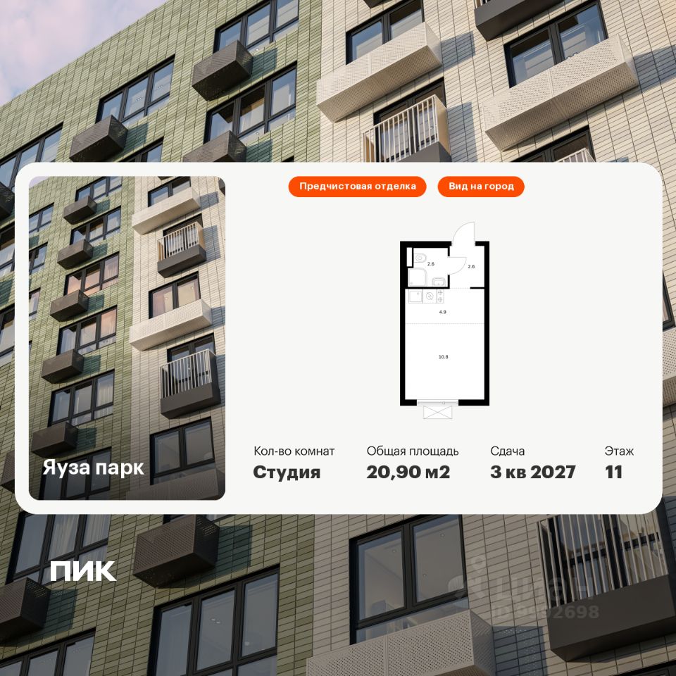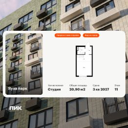 Продаётся квартира-студия площадью 20,9 кв.м на 11 этаже 24 этажного дома (Корпус 8, Секция 1) проекта ПИК Яуза парк. Светлый просторный подъезд на уровне земли, функциональная планировка, большие окна, предчистовая отделка.
