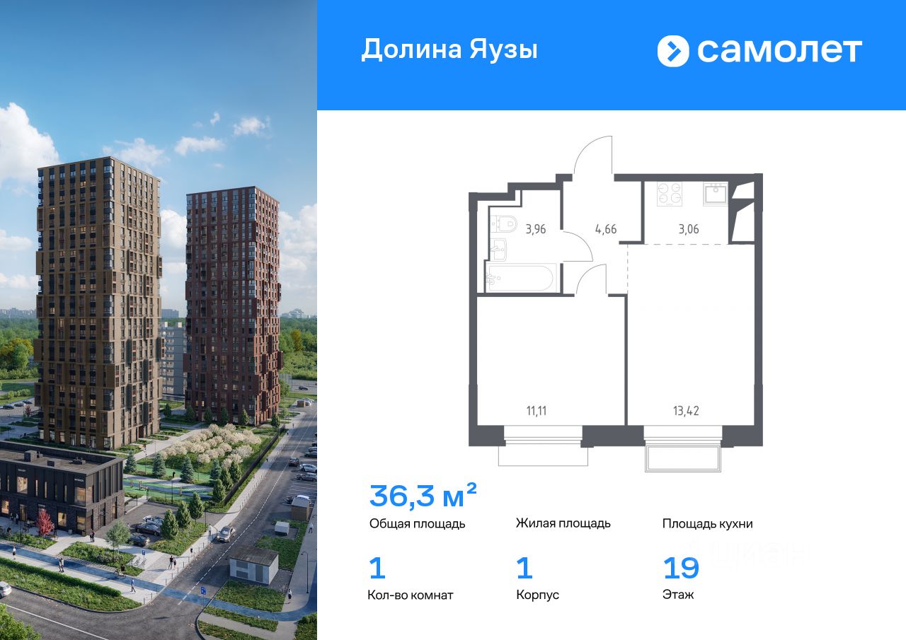Строим кварталы для жизни с заботой о будущем. Предлагается 1-комнатная квартира комфорт-класса 36,3 кв.м в корпусе 1 на 19 этаже, в ЖК "Долина Яузы"
