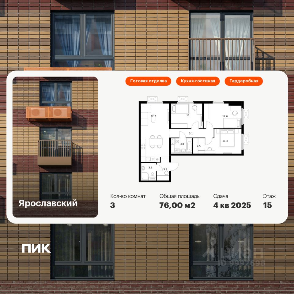 Продаётся 3-комн. квартира площадью 76 кв.м на 15 этаже 25 этажного дома (Корпус 16.1, Секция 1) проекта ПИК Ярославский. Светлый просторный подъезд на уровне земли, функциональная планировка, большие окна, c отделкой.