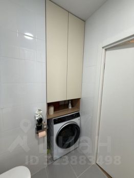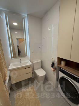 Просторная ванная комната с подсветкой зеркала и новой сантехникой, установлен биде душ, стиральная машина и встроенный шкаф.