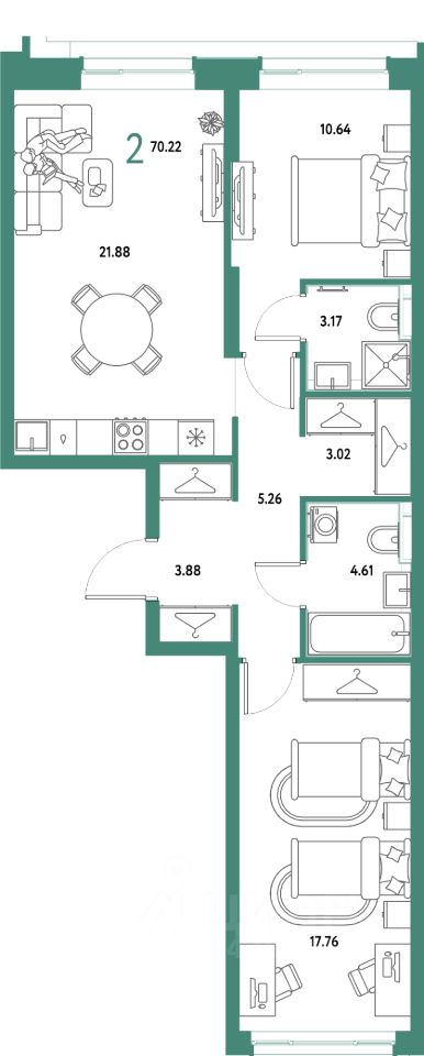 Продаётся 2-комнатная квартира в строящемся доме (Дом 2), срок сдачи: IV-кв. 2027, общей площадью 70.22 кв.м., на 15 этаже. Многоэтажные жилые дома с объектами инфраструктуры, расположенные по адресу: Московская область, г.о. Мытищи, г.Мытищи, мкр. 18Б, ул. Комарова.