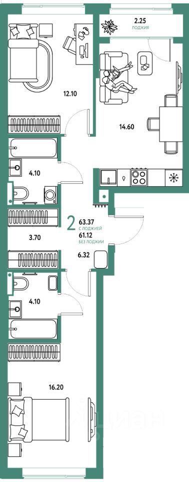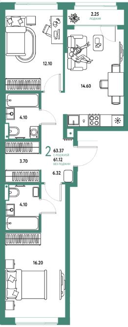 Продаётся 2-комнатная квартира в строящемся доме (Дом 1), срок сдачи: III-кв. 2026, общей площадью 63.37 кв.м., на 2 этаже. Многоэтажные жилые дома с объектами инфраструктуры, расположенные по адресу: Московская область, г.о. Мытищи, г.Мытищи, мкр. 18Б, ул. Комарова.