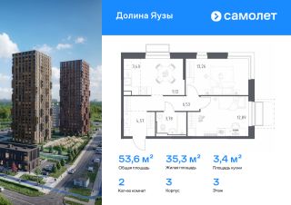 Строим кварталы для жизни с заботой о будущем. Предлагается 2-комнатная квартира комфорт-класса 53,55 кв.м в корпусе 3 на 3 этаже, в ЖК "Долина Яузы"