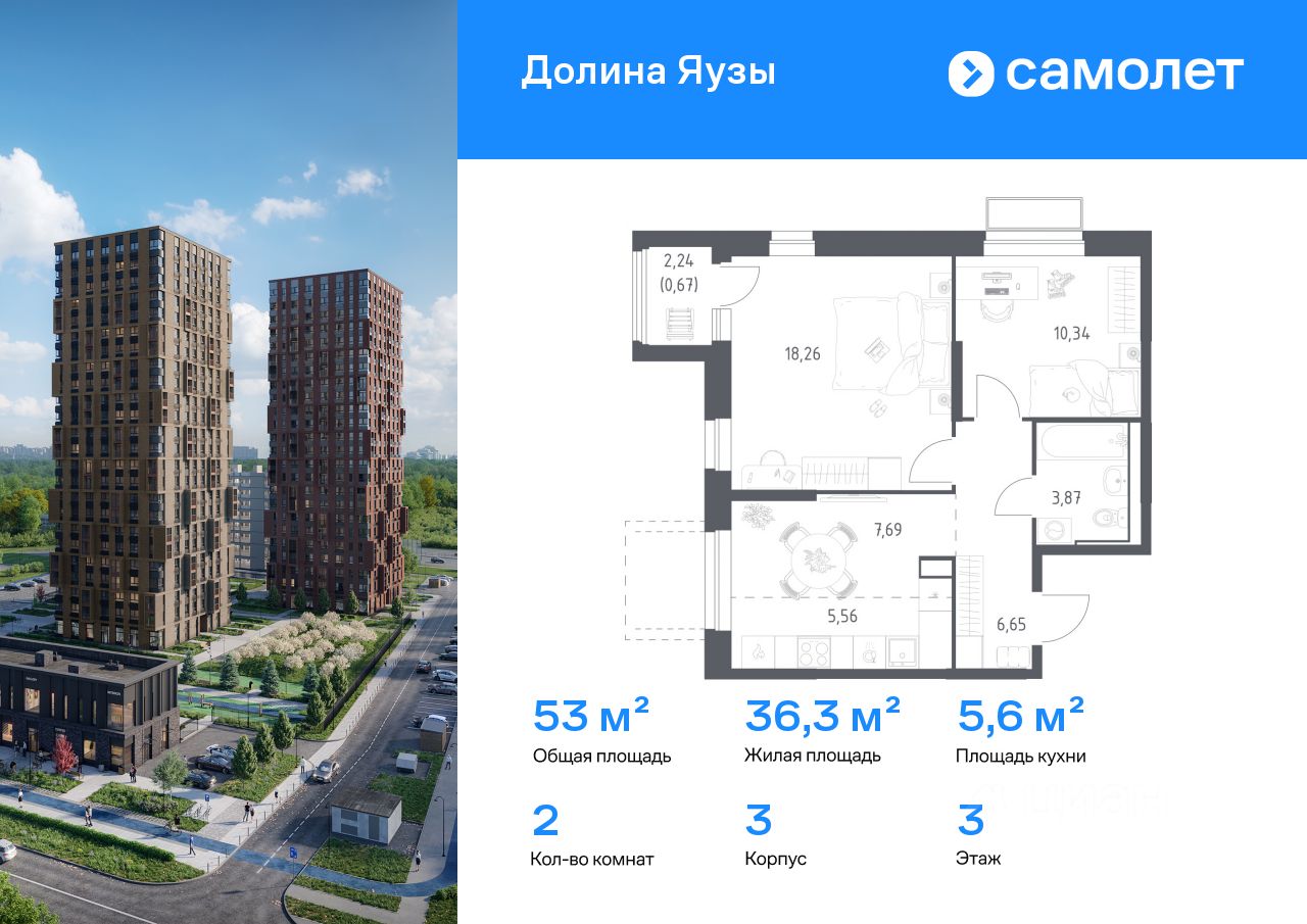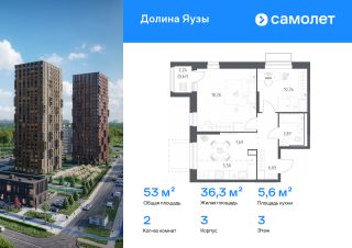 Строим кварталы для жизни с заботой о будущем. Предлагается 2-комнатная квартира комфорт-класса 53,04 кв.м в корпусе 3 на 3 этаже, в ЖК "Долина Яузы"
