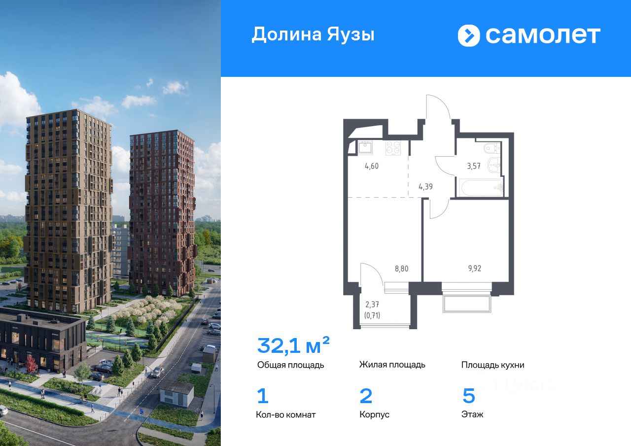 Строим кварталы для жизни с заботой о будущем. Предлагается 1-комнатная квартира комфорт-класса 32,1 кв.м в корпусе 2 на 5 этаже, в ЖК "Долина Яузы"
