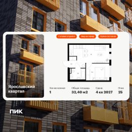 Продаётся 1-комн. квартира площадью 32,4 кв.м на 25 этаже 25 этажного дома (Корпус 2.4, Секция 1) проекта ПИК Ярославский квартал. Светлый просторный подъезд на уровне земли, функциональная планировка, большие окна, c отделкой.