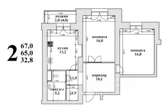 Жилая площадь 32,8 кв.м. (комнаты 16,8 и 16,0 кв.м).