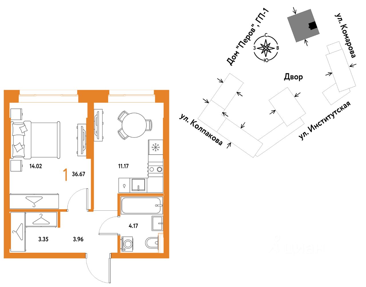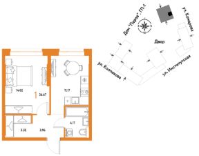 1комнатная квартира площадью 36,67кв. м. на 5 этаже от застройщика Страна Девелопмент.