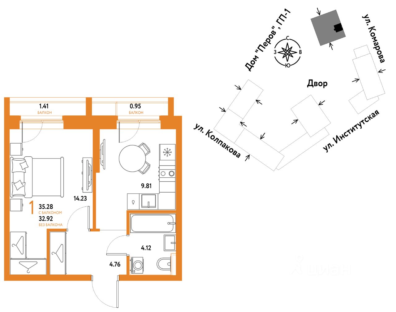 1комнатная квартира площадью 35,28кв. м. на 7 этаже от застройщика Страна Девелопмент.
