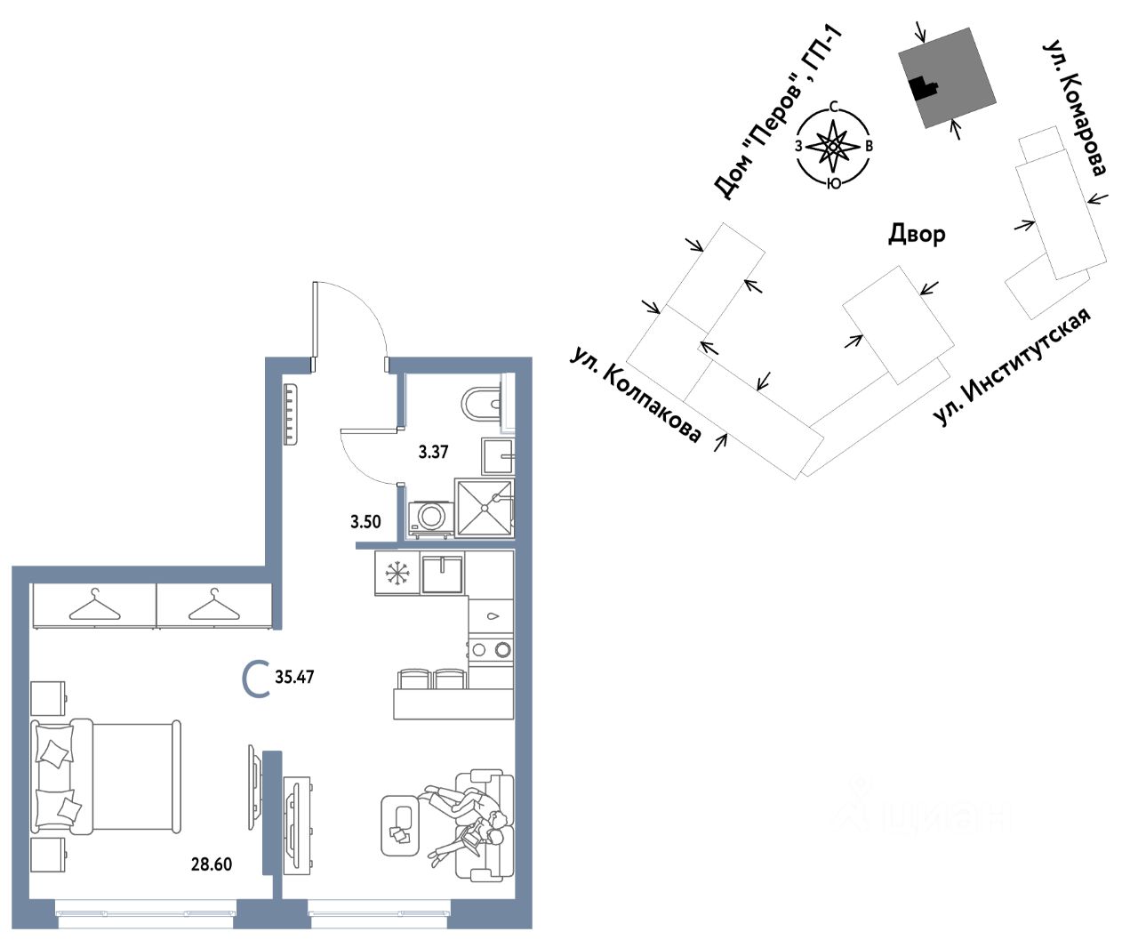 1комнатная квартира площадью 35,47кв. м. на 20 этаже от застройщика Страна Девелопмент.