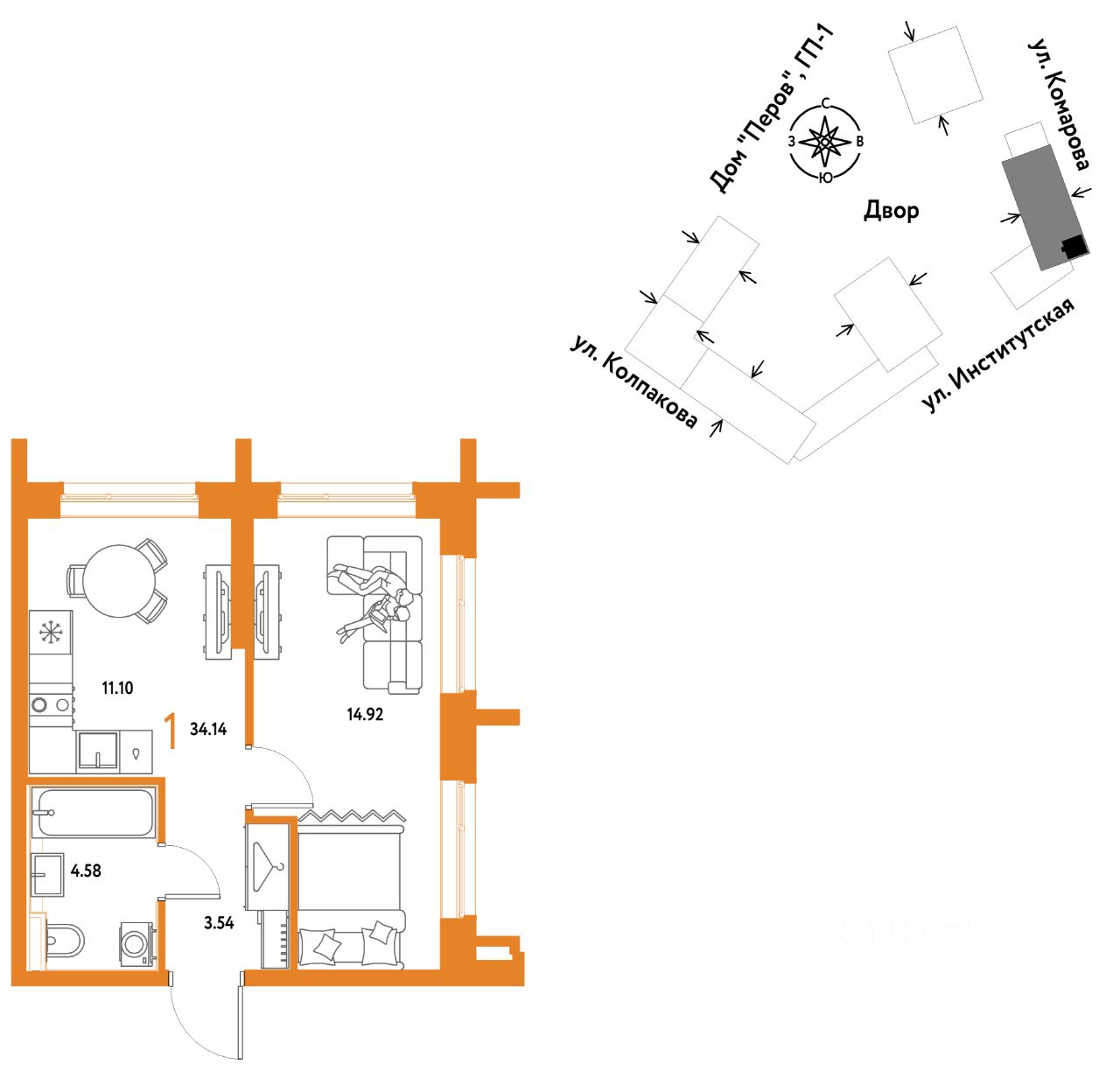 1комнатная квартира площадью 34,14кв. м. на 4 этаже от застройщика Страна Девелопмент.