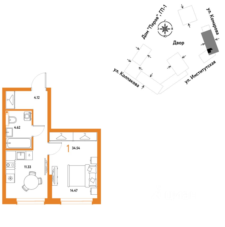1комнатная квартира площадью 34,54кв. м. на 4 этаже от застройщика Страна Девелопмент.