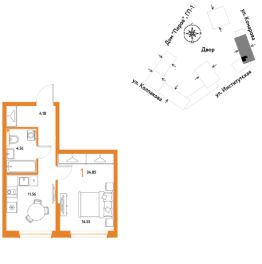 1комнатная квартира площадью 34,85кв. м. на 16 этаже от застройщика Страна Девелопмент.