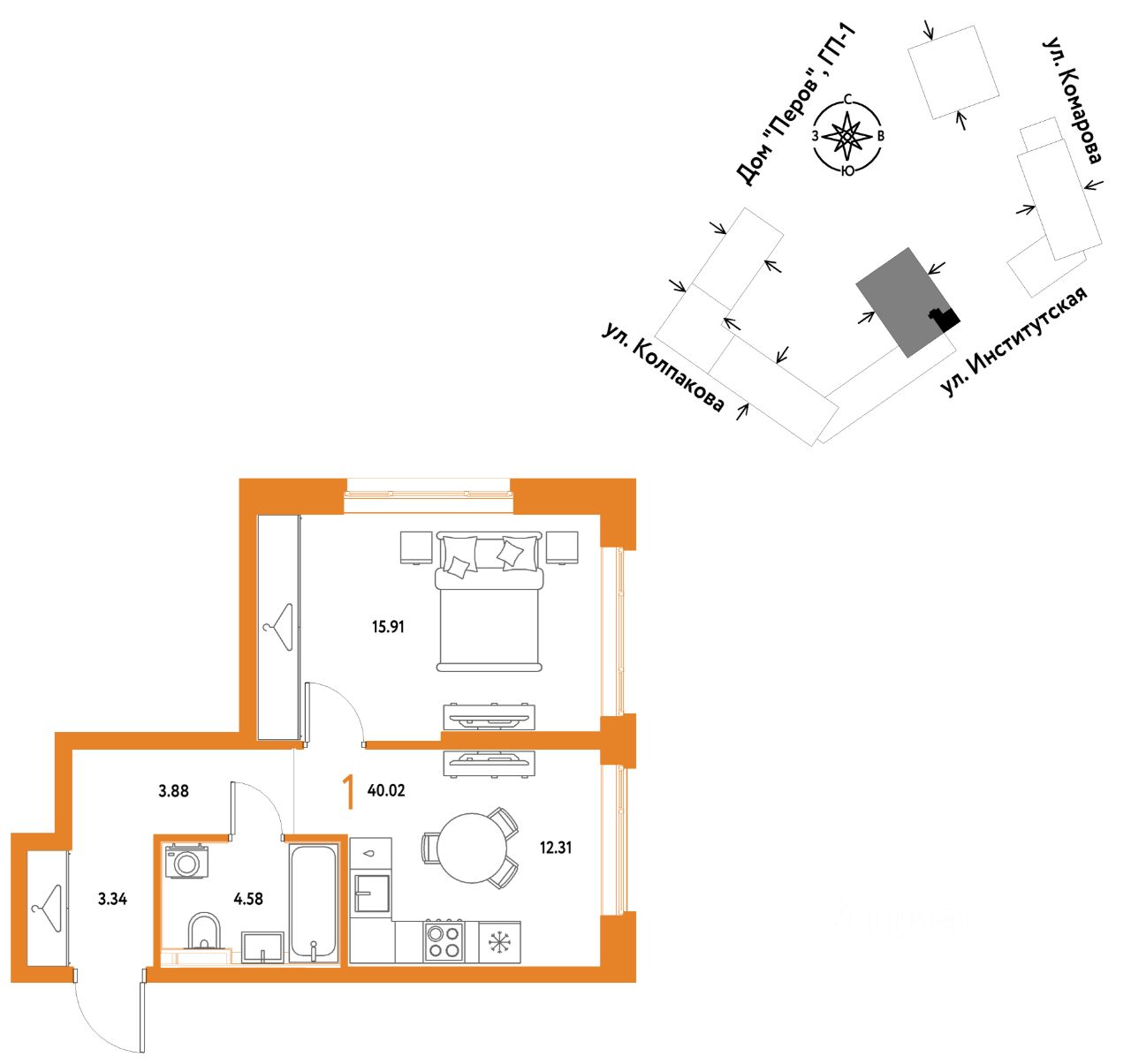 1комнатная квартира площадью 40,02кв. м. на 8 этаже от застройщика Страна Девелопмент.