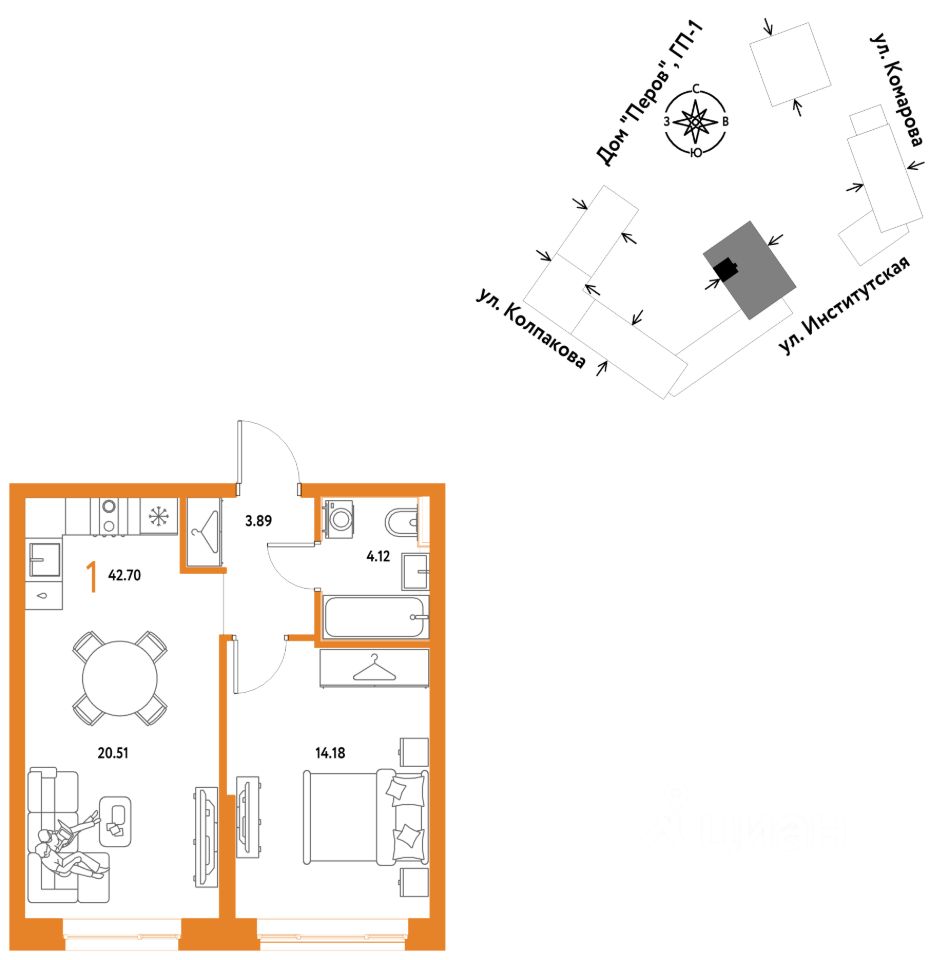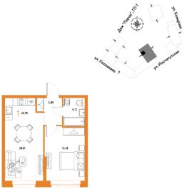 1комнатная квартира площадью 42,7кв. м. на 16 этаже от застройщика Страна Девелопмент.