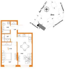 1комнатная квартира площадью 47,19кв. м. на 4 этаже от застройщика Страна Девелопмент.