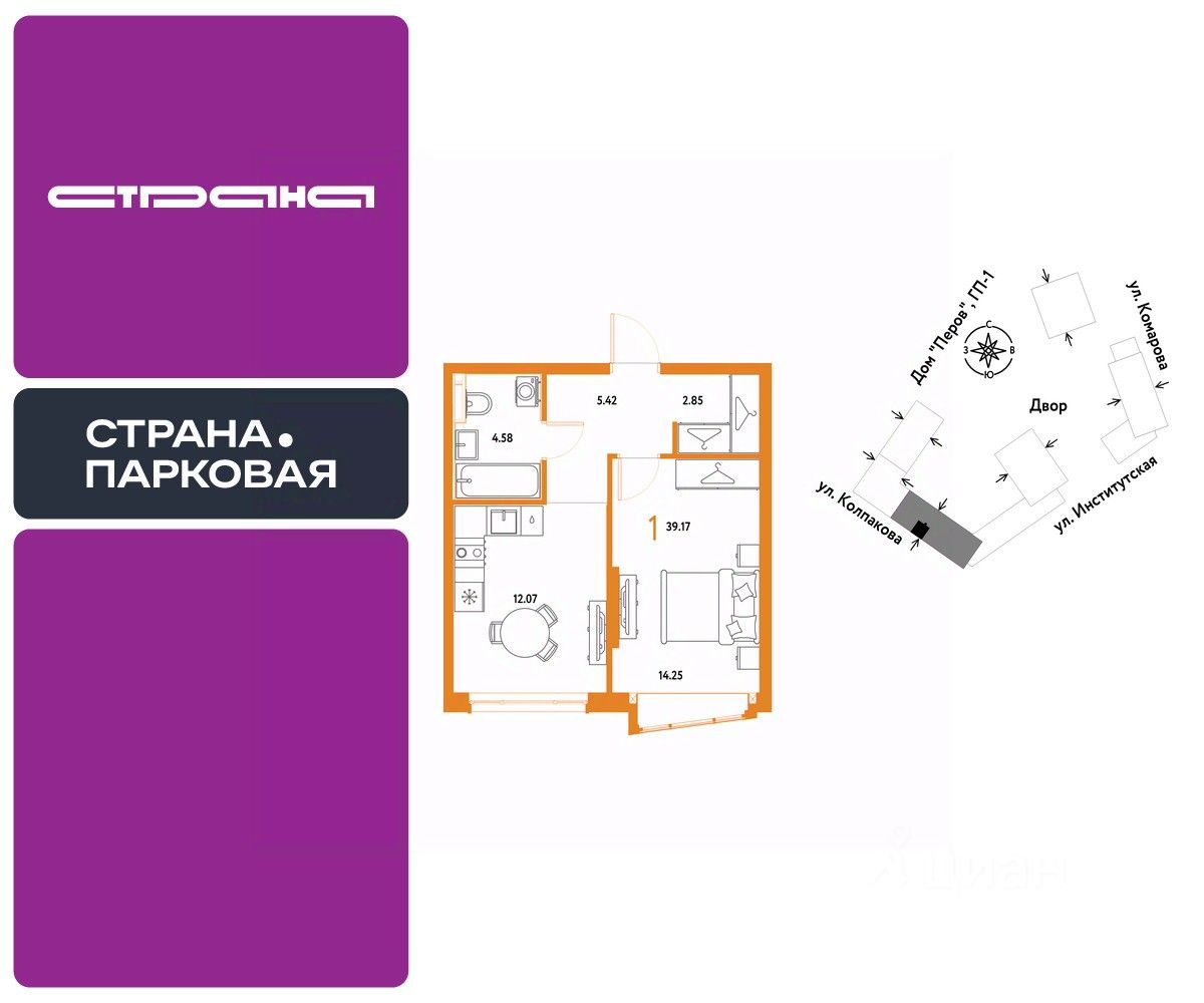 1комнатная квартира площадью 39,17кв. м. на 6 этаже от застройщика Страна Девелопмент.