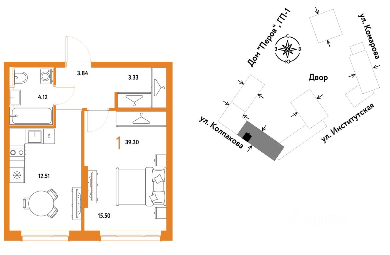 1комнатная квартира площадью 39,3кв. м. на 7 этаже от застройщика Страна Девелопмент.