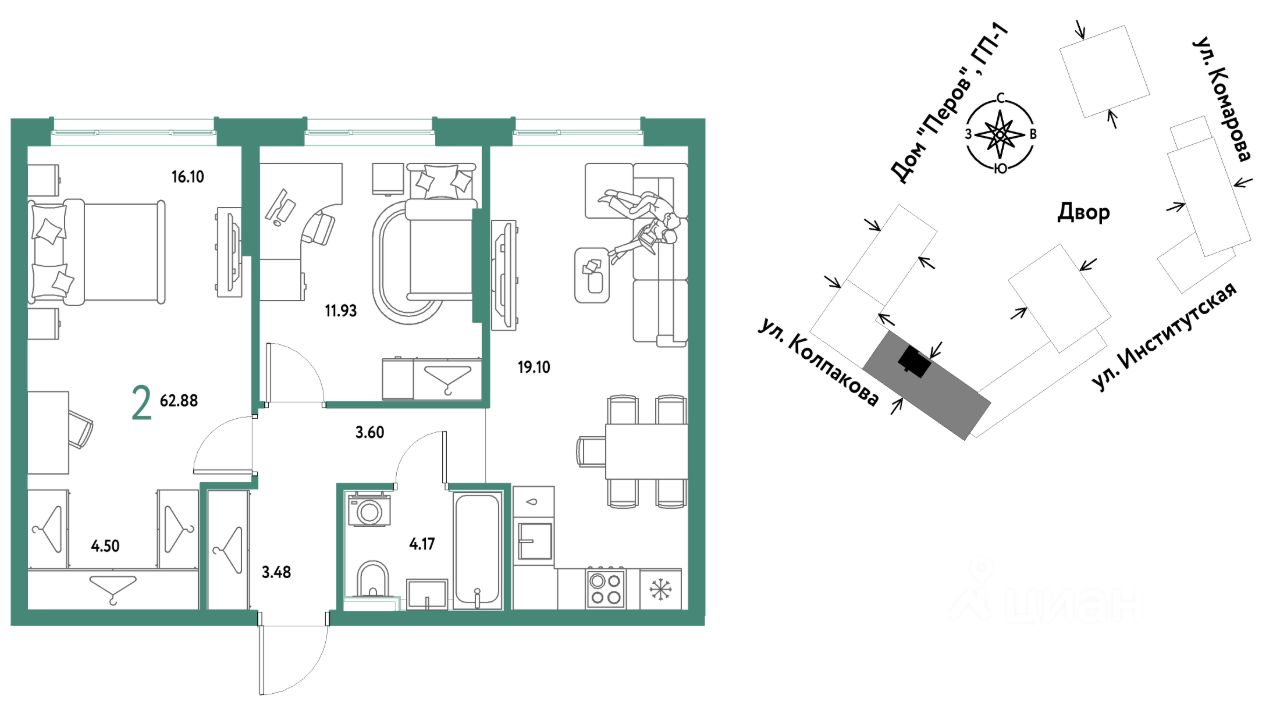 2комнатная квартира площадью 62,88кв. м. на 8 этаже от застройщика Страна Девелопмент.
