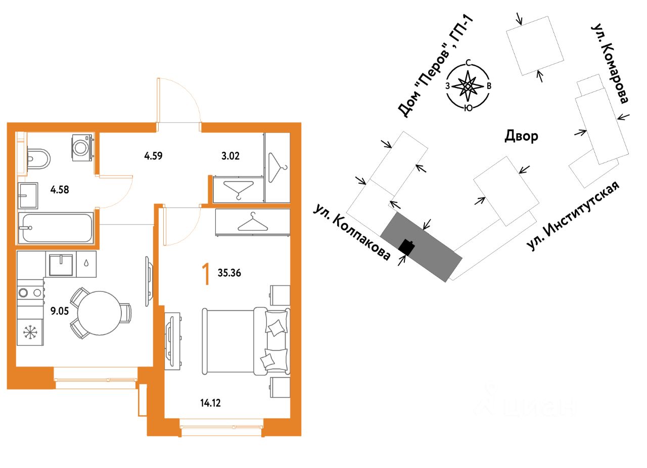1комнатная квартира площадью 35,36кв. м. на 12 этаже от застройщика Страна Девелопмент.