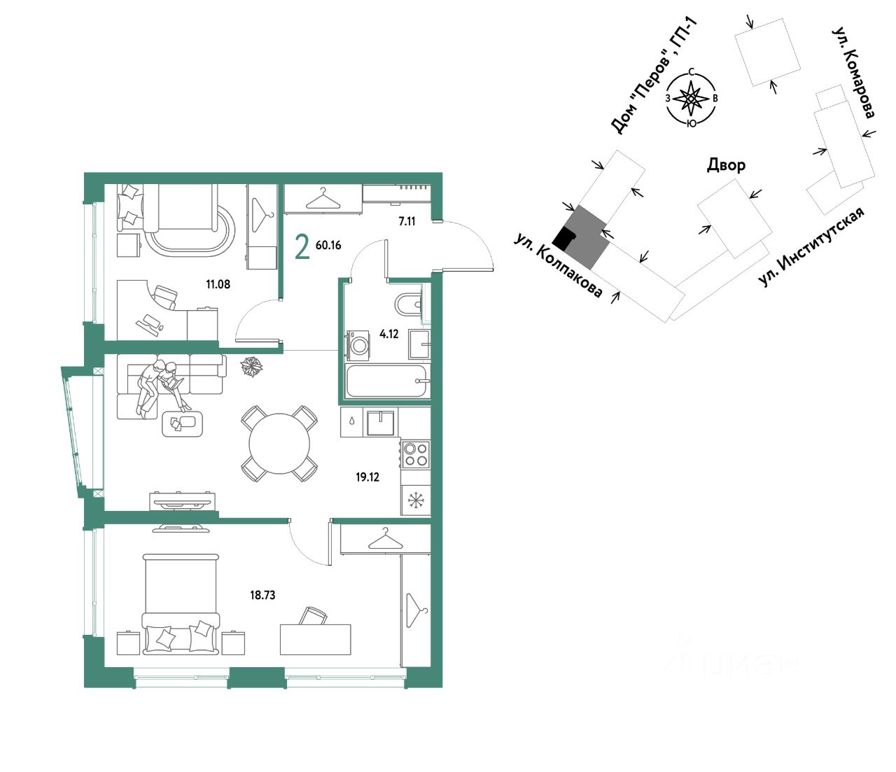 2комнатная квартира площадью 60,16кв. м. на 4 этаже от застройщика Страна Девелопмент.