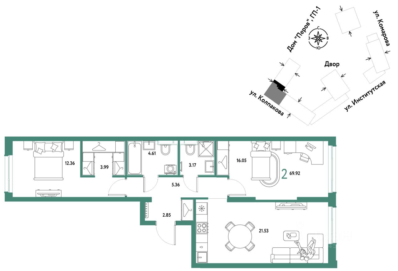 2комнатная квартира площадью 69,92кв. м. на 9 этаже от застройщика Страна Девелопмент.