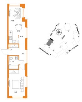1комнатная квартира площадью 42,48кв. м. на 2 этаже от застройщика Страна Девелопмент.