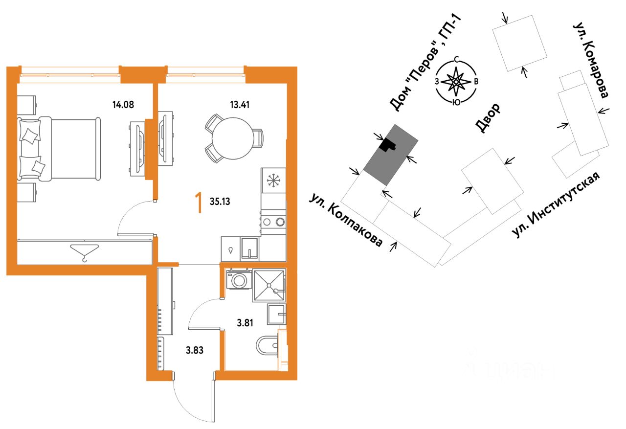 1комнатная квартира площадью 35,13кв. м. на 3 этаже от застройщика Страна Девелопмент.