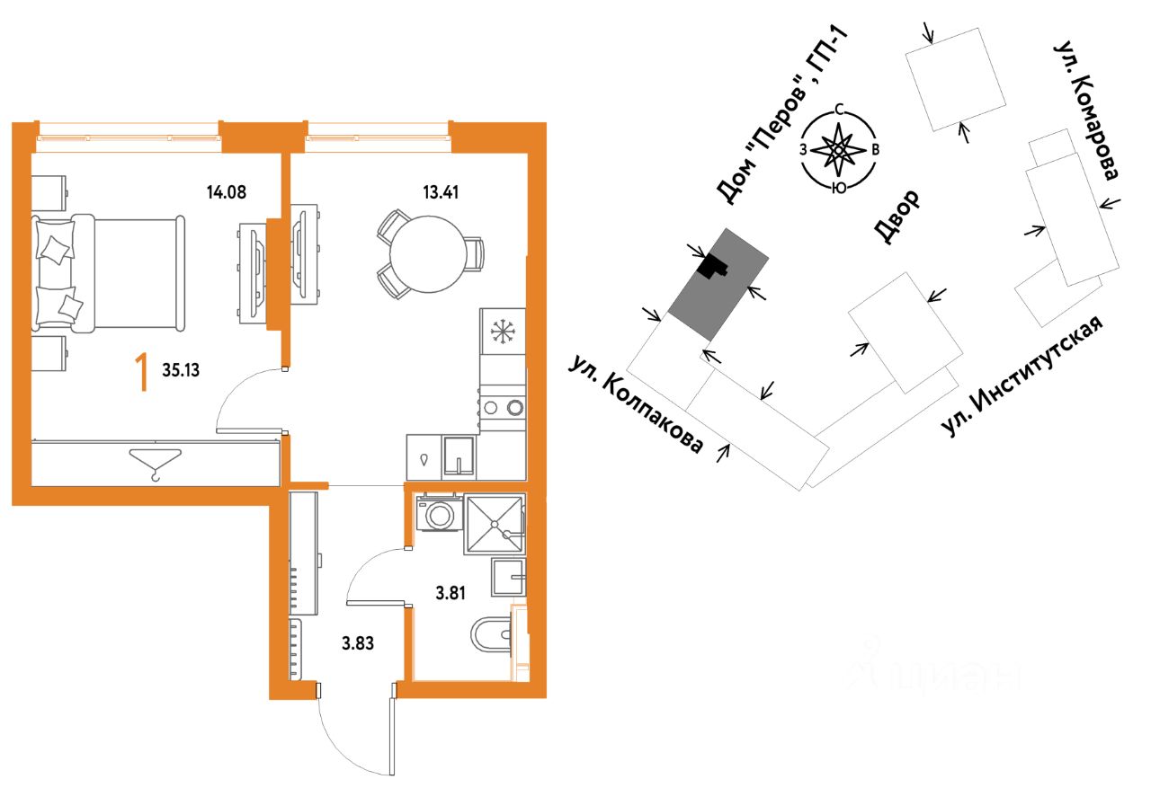 1комнатная квартира площадью 35,13кв. м. на 5 этаже от застройщика Страна Девелопмент.