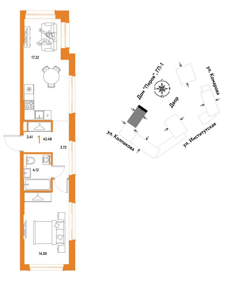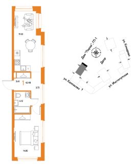 1комнатная квартира площадью 42,48кв. м. на 5 этаже от застройщика Страна Девелопмент.