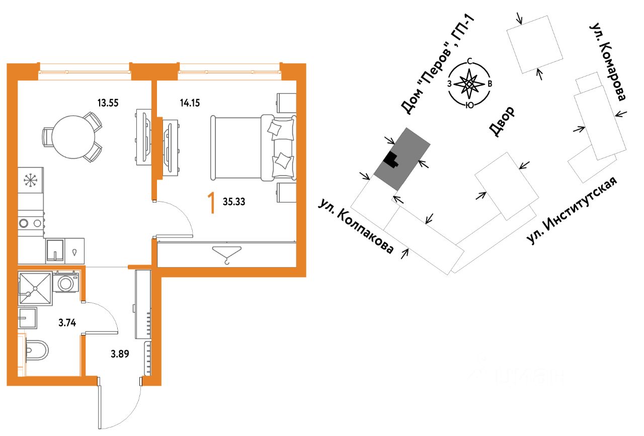 1комнатная квартира площадью 35,33кв. м. на 8 этаже от застройщика Страна Девелопмент.