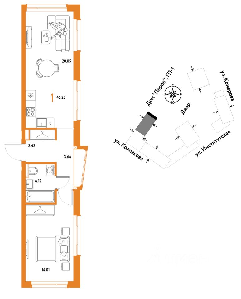 1комнатная квартира площадью 45,25кв. м. на 11 этаже от застройщика Страна Девелопмент.