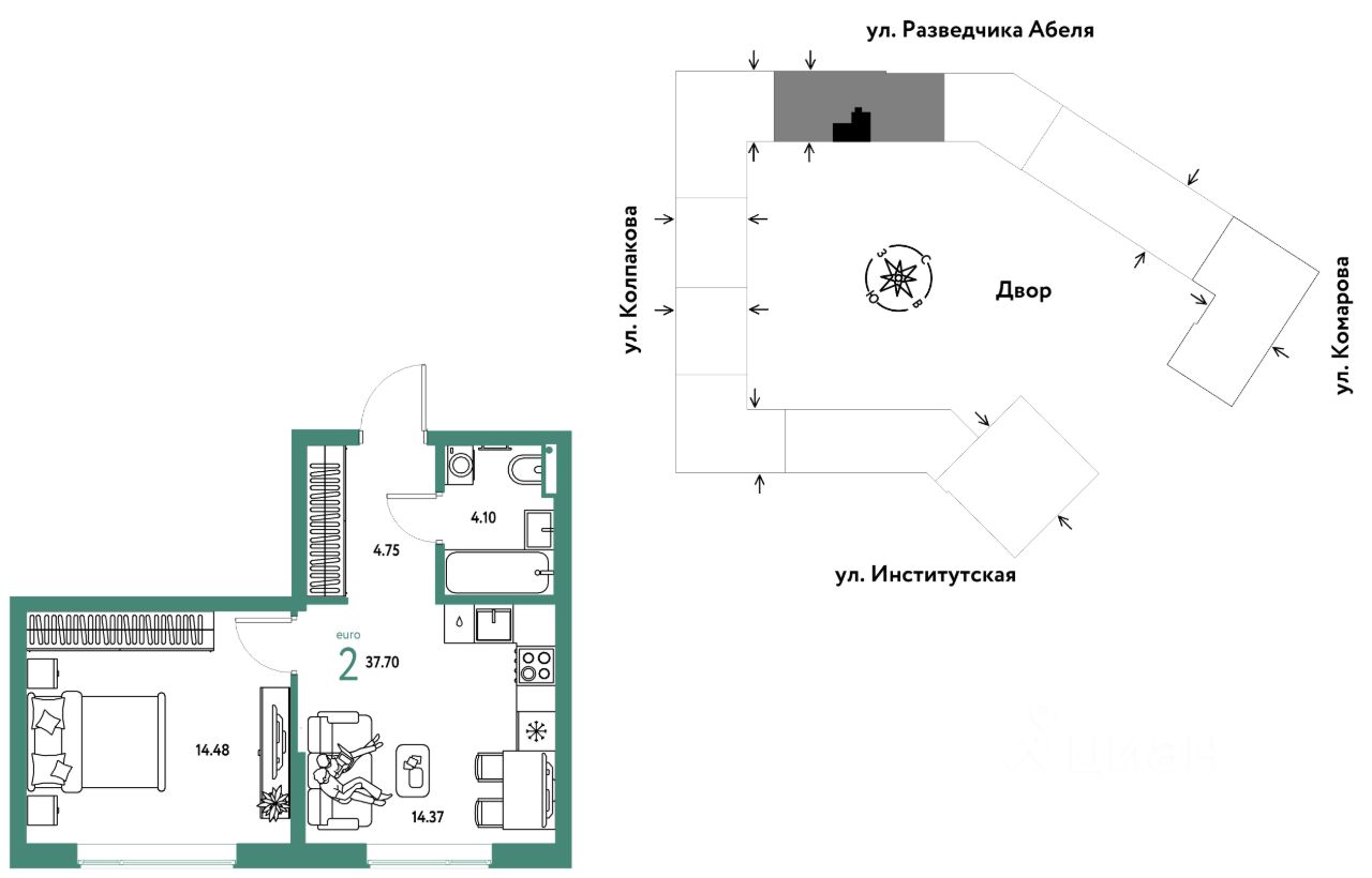 2комнатная квартира площадью 37,7 кв. м. на 11 этаже от застройщика Страна Девелопмент.