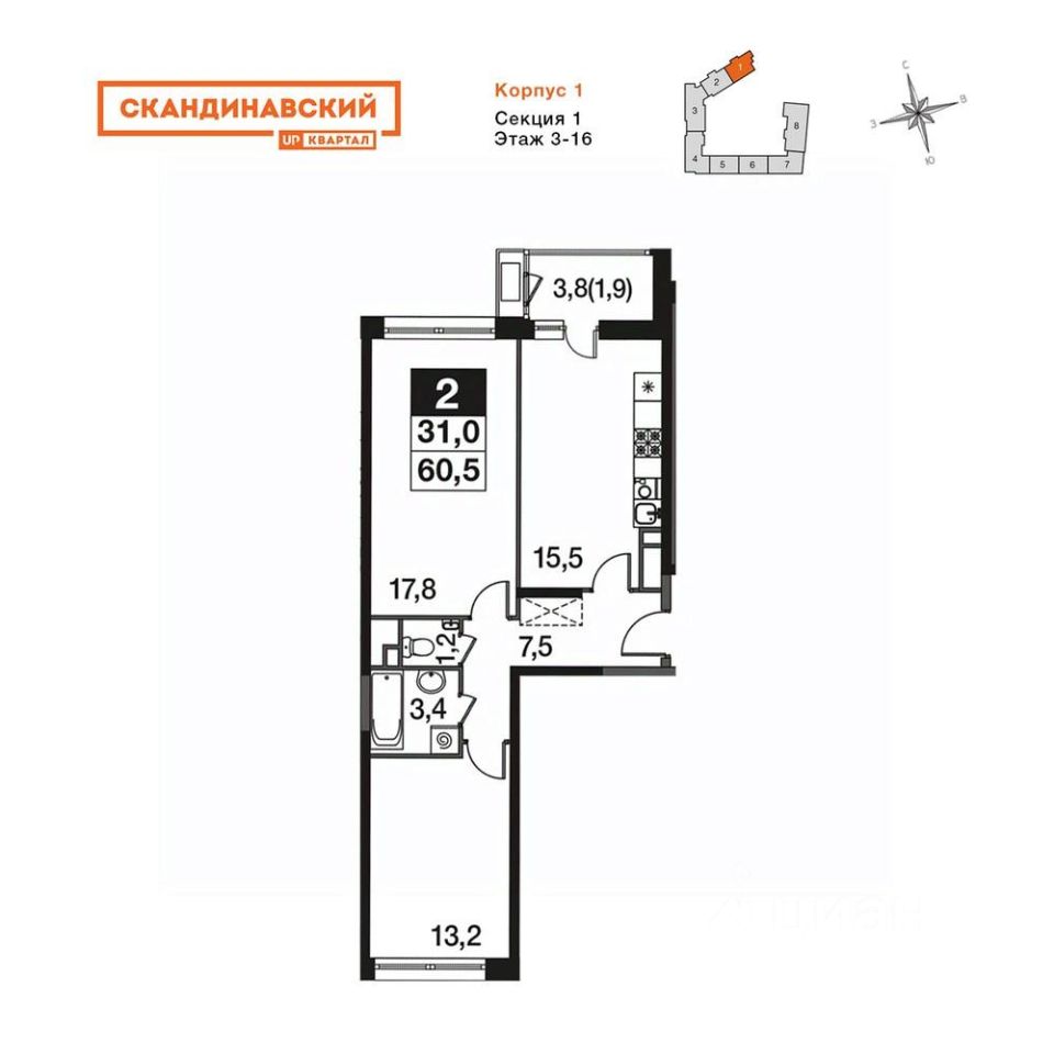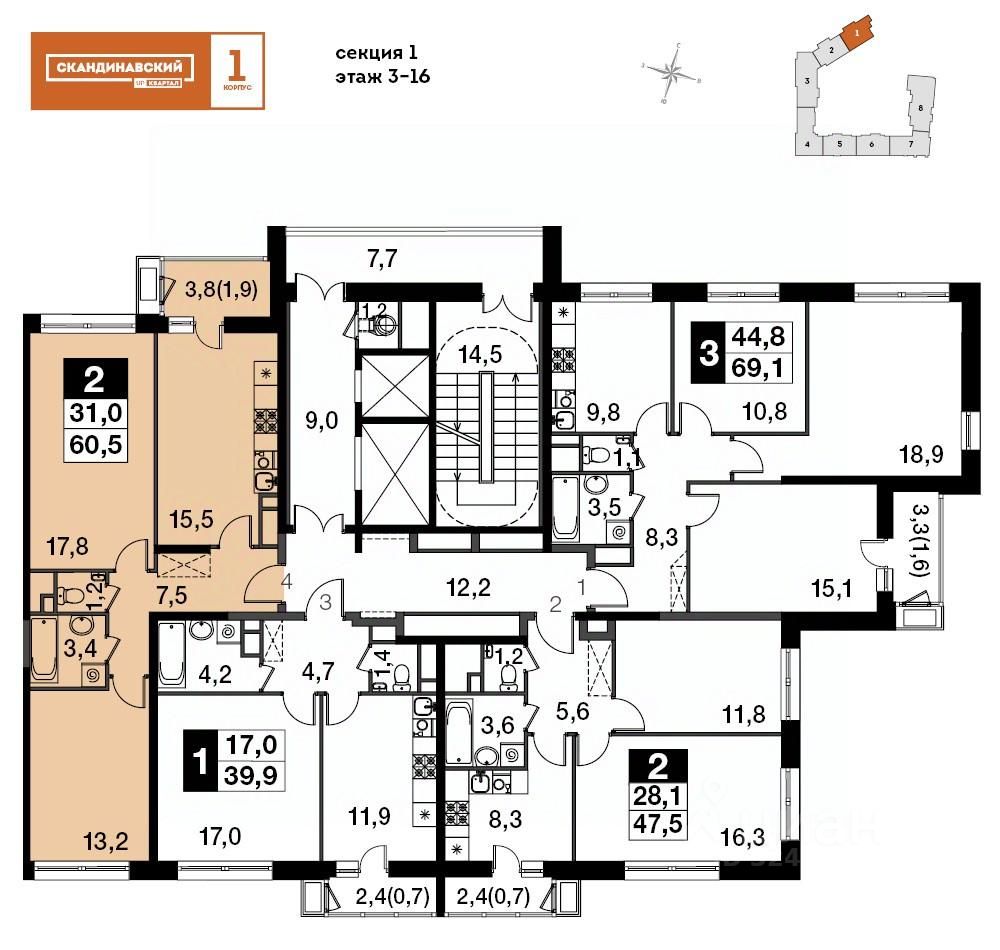 Продаётся 2-к квартира номер 8 общей площадью 60.5 кв.м. на 3-м этаже 16 этажного здания. Без отделки. Цена с учётом скидки.