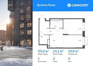 Строим кварталы для жизни с заботой о будущем. Предлагается 1-комнатная квартира комфорт-класса 53,2 кв.м в корпусе 2 на 3 этаже, в ЖК "Долина Яузы"