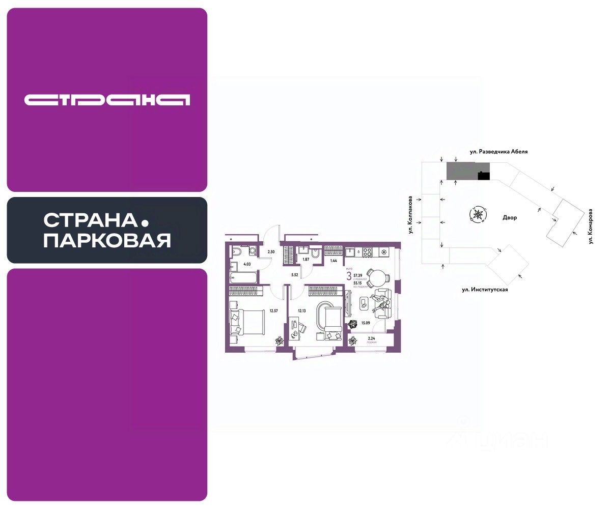 3комнатная квартира площадью 57,39 кв. м. на 4 этаже от застройщика Страна Девелопмент.